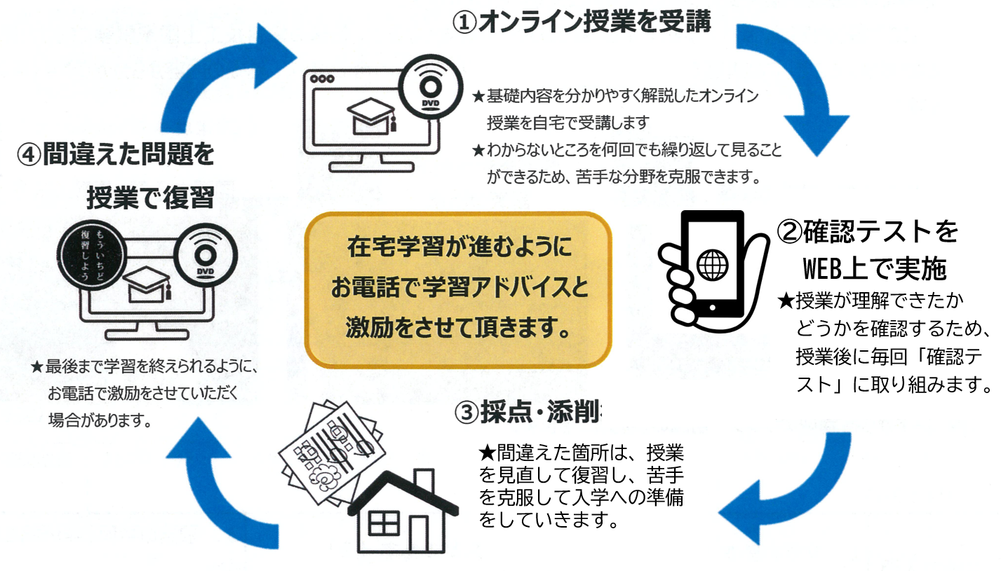 本プログラムでは、本校が指定した内容の映像授業をご自宅で受講し、一から知識を身につけていきます。