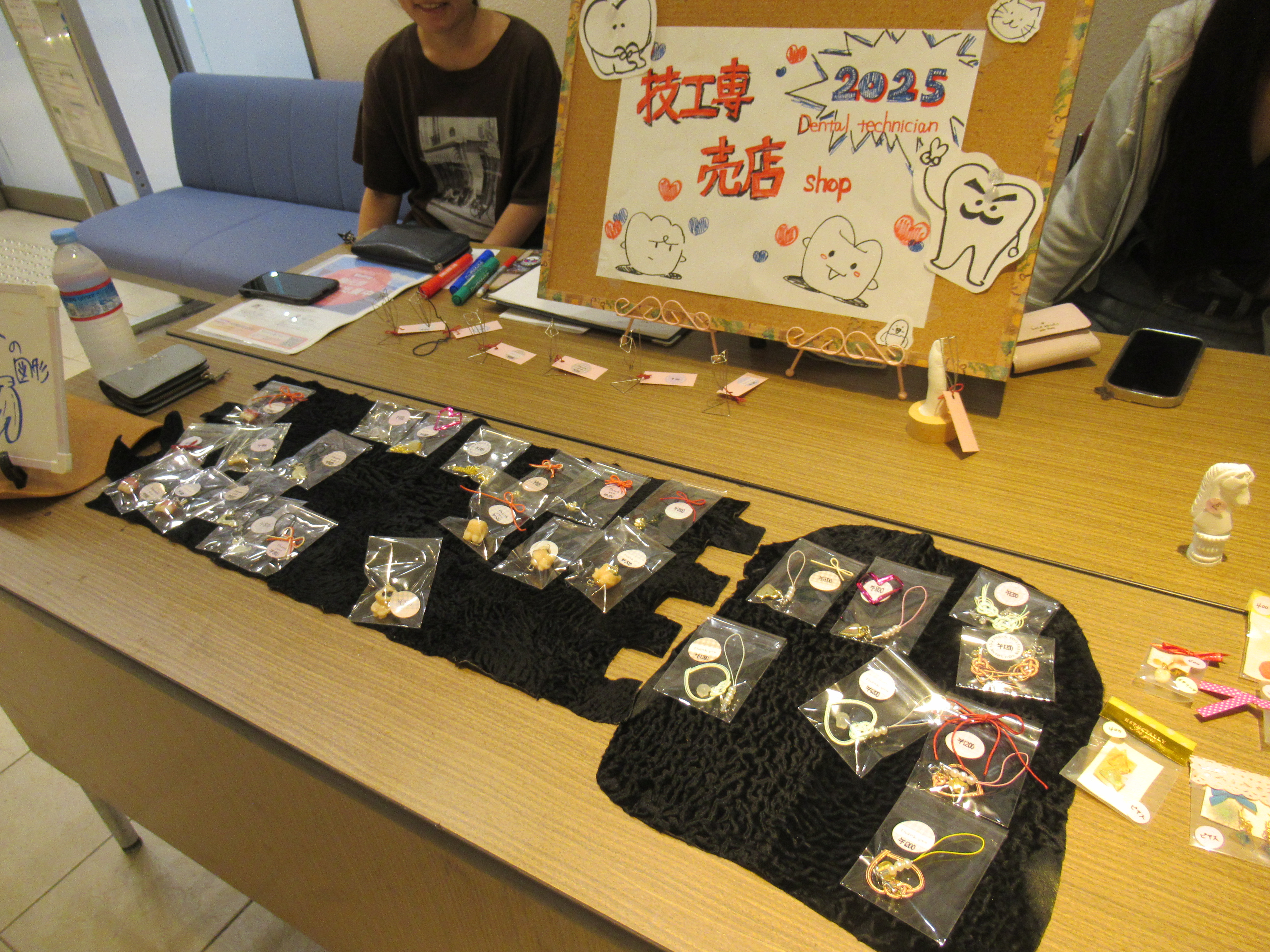 キーホルダーやアクセサリーなど、歯科に関係するものからしないものまで、学生たちが思い思いに製作した小物を出品していました。